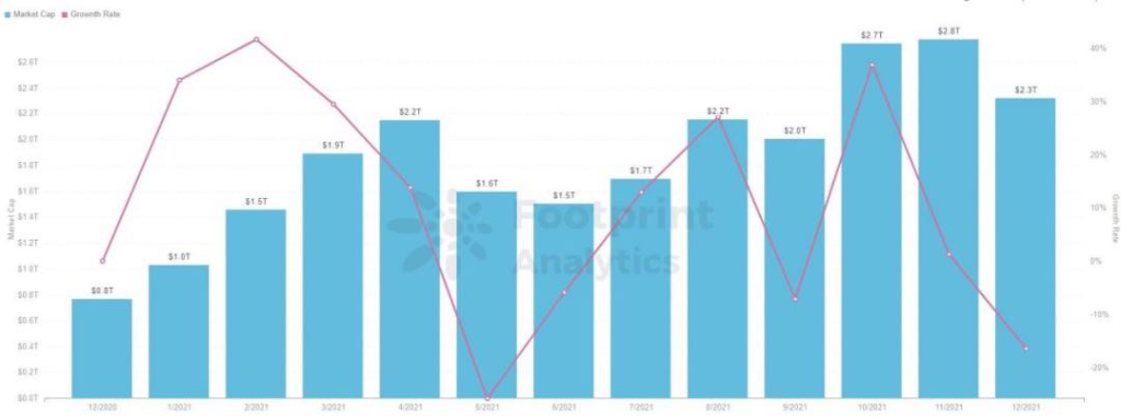 Footprint Analytics 数据显示,越来越多的资金正在流入 Web3 领域,全球加密市场总市值在过去一年翻倍增长,目前已超 2 万亿美元。